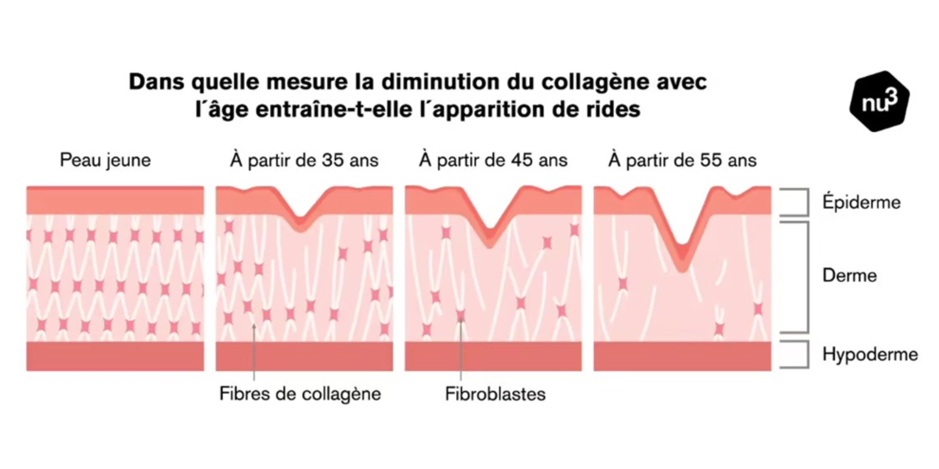 Les fibres de collagène se fissurent, se désorganisent dans la peau, ce qui conduit à l’apparition de rides et d’un relâchement cutané.